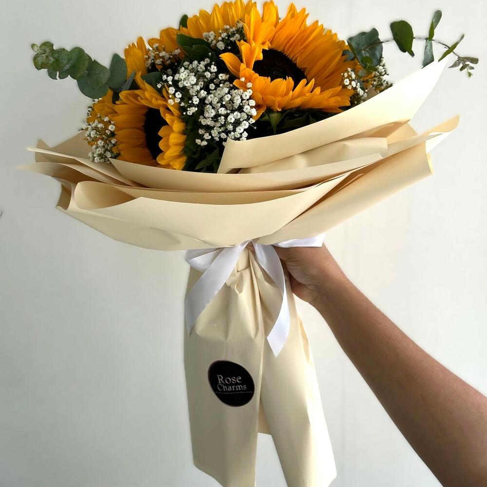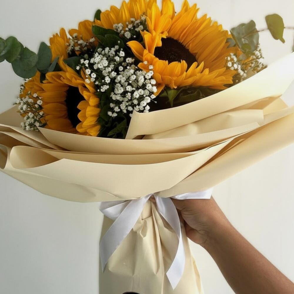 Brighten someone’s day with “Sun-Kissed Smiles”, a radiant bouquet of 11 golden sunflowers, beaming with joy and warmth. Each sunflower is a little piece of sunshine, lovingly surrounded by fresh, seasonal fillers that add delicate texture and volume to this uplifting arrangement. Wrapped in elegant, nature-inspired wrapping and tied with a rustic ribbon, this bouquet is perfect for celebrations, congratulations, or simply bringing light to someone’s life. Let every petal remind them: happiness is blooming right here. ✨ Features: 🌻 11 vibrant sunflowers – symbols of joy, loyalty, and positivity 🍃 Seasonal floral fillers – curated to complement and enhance 🎁 Stylish, eco-friendly wrapping with artistic finishing touches 🚚 Same-day delivery available for a sunshine surprise Shine a little brighter today. 💛 Order “Sun-Kissed Smiles” now and send a bouquet full of golden happiness.
