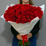 Experience the grandeur of love with this exquisite floral arrangement. A stunning spectacle of 111 rich red roses, meticulously bundled in an elegant white wrapping, accentuated with a gorgeous red ribbon. This florists special is sure to steal hearts and spread joy with its breath-taking beauty and romantic charm.