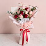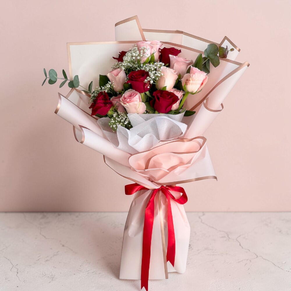 Bouquet of 12 red and pink roses with fillers in a nice wrapping. Beautiful bouquet of 12 red and pink roses with delicate fillers, elegantly wrapped in premium paper for a romantic and vibrant look. This red and pink rose bouquet is perfect for anniversaries, birthdays, and heartfelt celebrations. Fresh, handpicked blooms offer a stunning color blend and long-lasting beauty. Care tip: Trim stems at an angle, place in clean water, and keep away from direct sunlight. Change water every 2 days to maintain freshness and extend vase life.