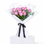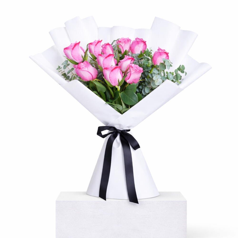 Compact defination of purple roses — subtle and refined. Dark Purple Rose 11 Stems, Eucalyptus 3 Stems