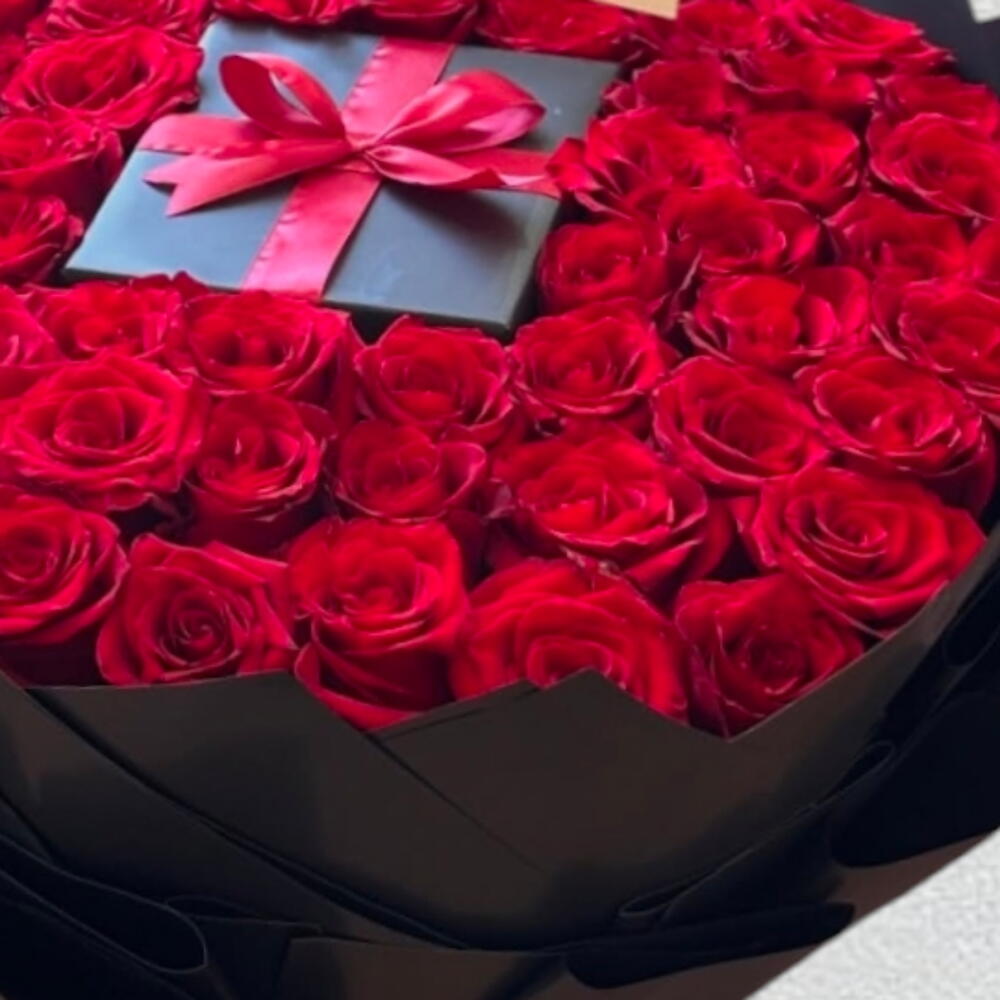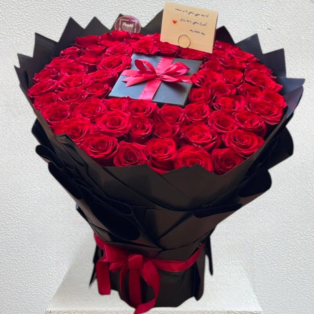 The flowers are tightly clustered together and wrapped in black paper, creating a stark contrast with the deep red blooms.