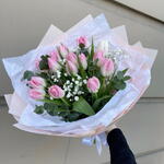 Eucalyptus - 3 pcs Gypsophila - 3 pcs pink tulip - 15 pcs