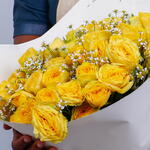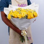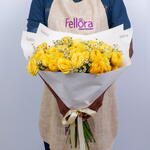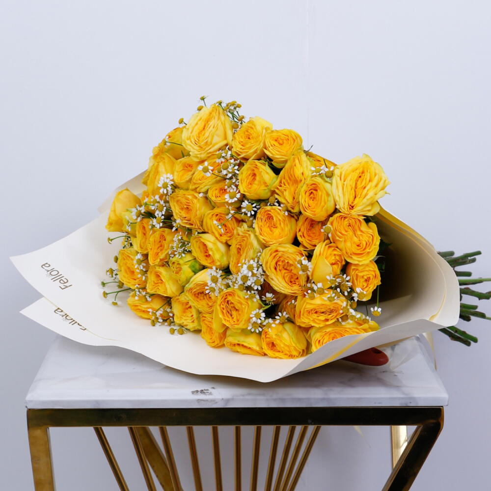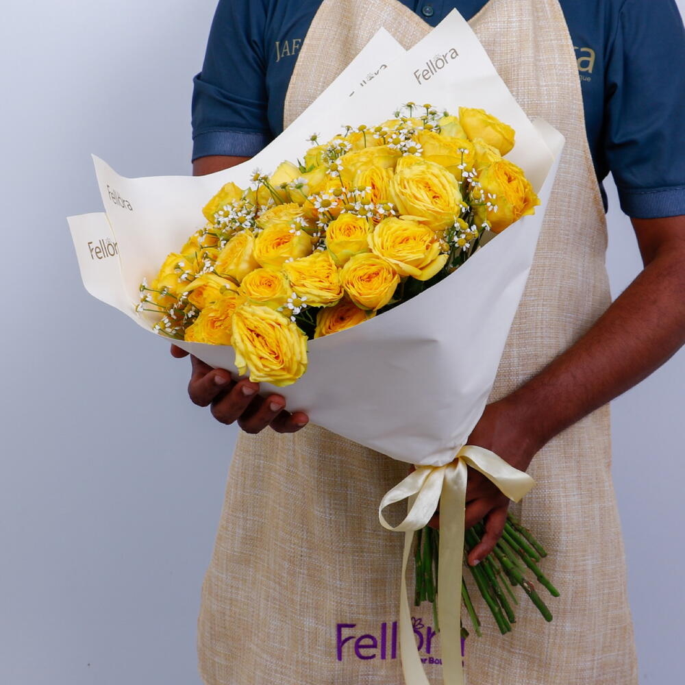Bouquet of 15 stems premium yellow peony roses with Tanacetum and wrapped in a natural paper wrapping