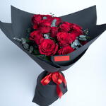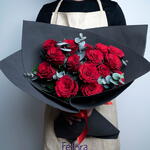 Bouquet of 15 red roses with eucalyptus leaves and tied with red ribbon