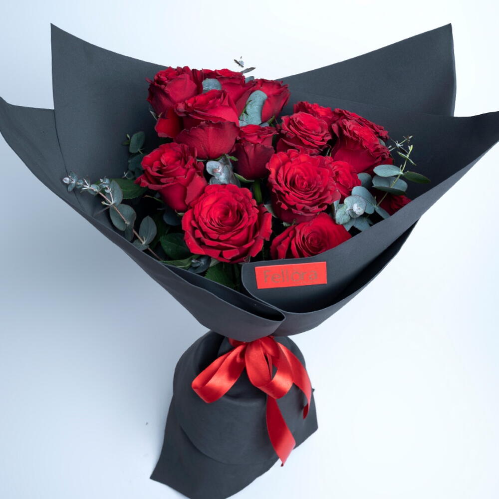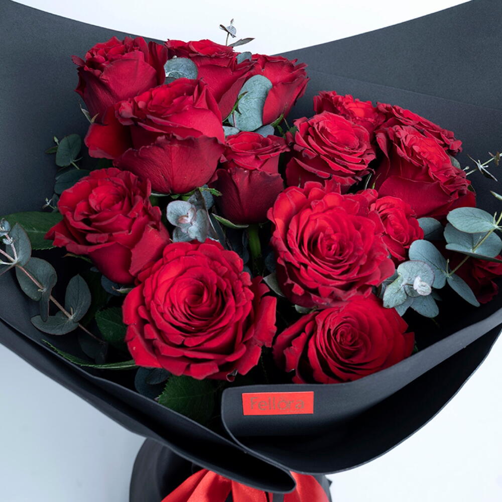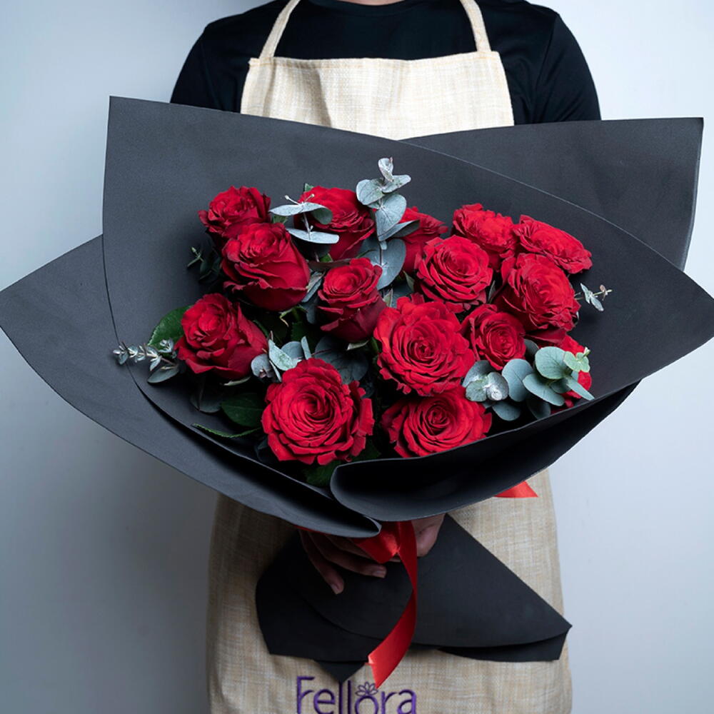 Bouquet of 15 red roses with eucalyptus leaves and tied with red ribbon