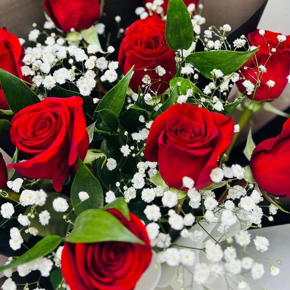Gypsophila - 5 pcs red roses - 15 pcs