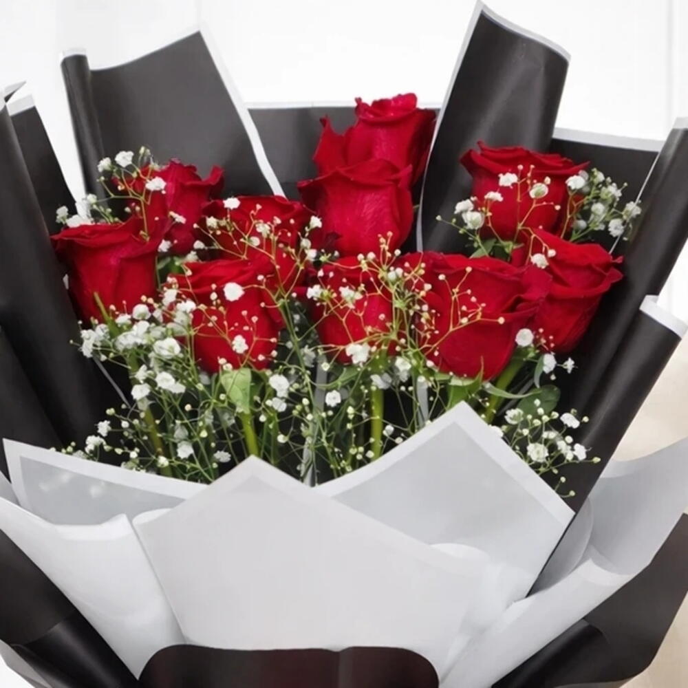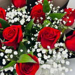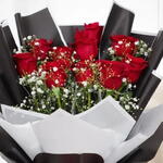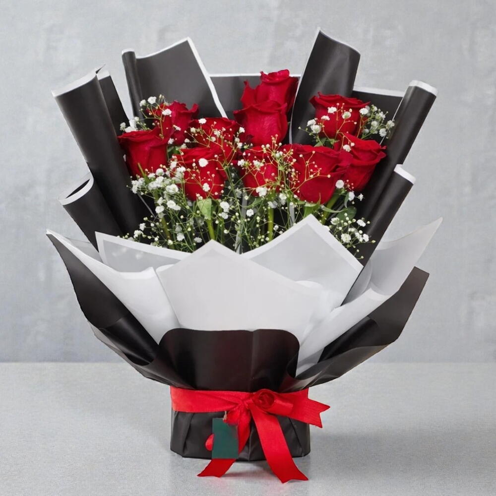 This stunning bouquet, features vibrant red roses complemented by delicate white babys breath (gypsophila) filler flowers. The arrangement is elegantly wrapped in classic black paper and secured with a striking red ribbon, creating a bold and stylish contrast.