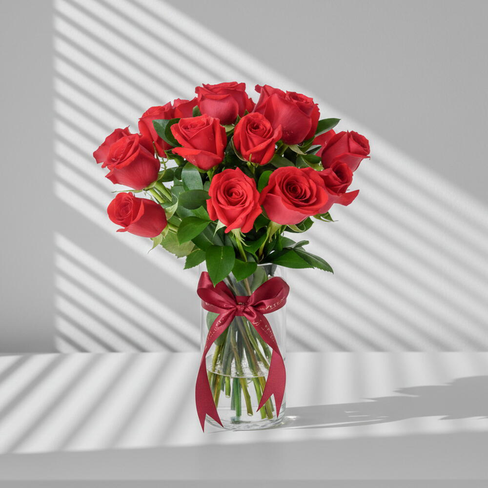 premium red roses - 15 pcs small cylinder glass vase - 1 pcs