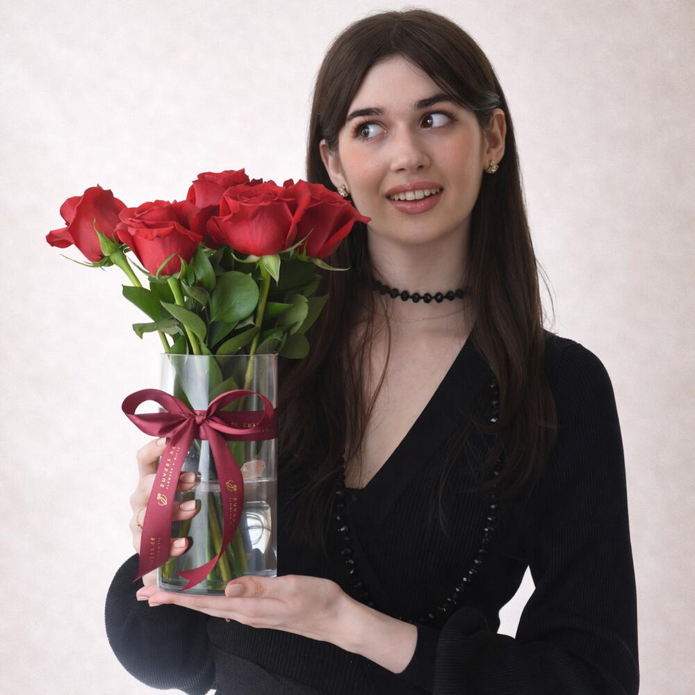 Mysterious, intimate, and effortlessly romantic, Roses After Midnight in Glass Vase captures the quiet intensity of love that speaks strongest when the world slows down. Featuring 15 premium red roses accented with lush greenery, the arrangement is styled in a 10x20 cm clear cylinder glass vase and finished with the ZUVEES Signature Burgundy Ribbon. Elegant yet deeply expressive, this Valentine’s Day piece is designed for moments meant to be remembered.