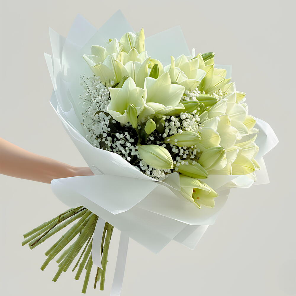Graceful and timeless, this 15 white lilies bouquet wrapped in elegant white paper is a symbol of purity, peace, and sophistication. Perfect for weddings, anniversaries, sympathy gestures, or to express sincere admiration and respect. Each lily is carefully hand-picked and beautifully arranged to create a stunning, serene presentation that speaks from the heart. Key Features: 15 premium fresh white lilies Wrapped in elegant white packaging for a clean, minimalist look Symbolizes purity, peace, and elegance Ideal for sympathy, weddings, anniversaries, or formal occasions