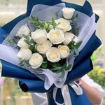 The bouquet is white roses wrapped in dark blue paper on the outside and a layer of white, translucent paper on the inside, tied with a white ribbon. The arrangement also includes greenery, such as eucalyptus, mixed in with the roses.