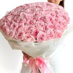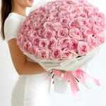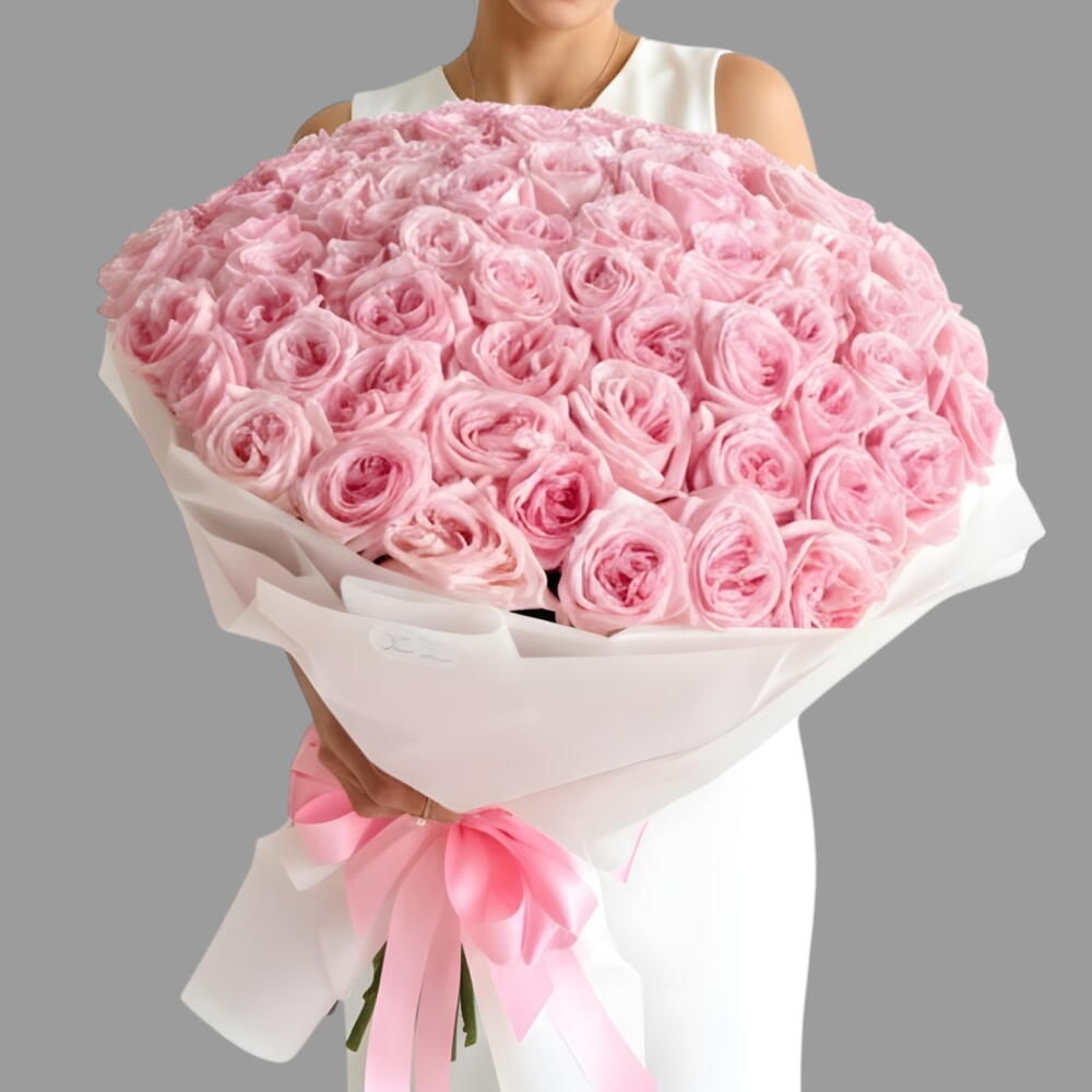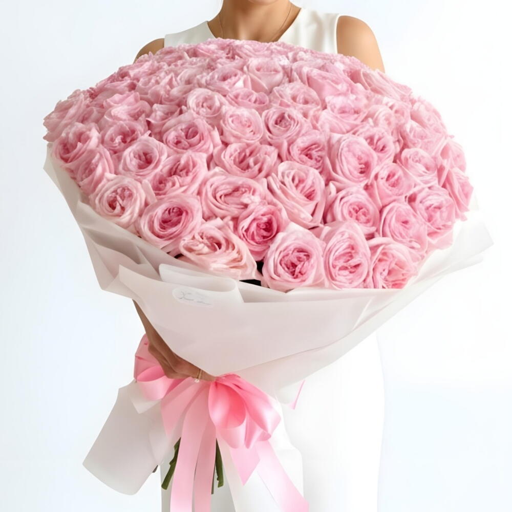 large, luxurious bouquet of light pink roses, elegantly arranged and wrapped in white paper. The voluminous arrangement features numerous blooms, possibly 152, or more stems, depending on the specific florist and size chosen.