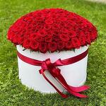 151 stems red roses arranged in a white velvet round box with a red ribbon.