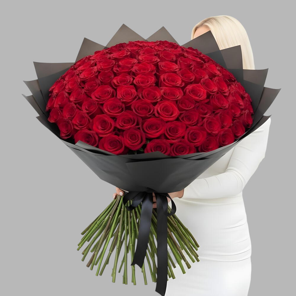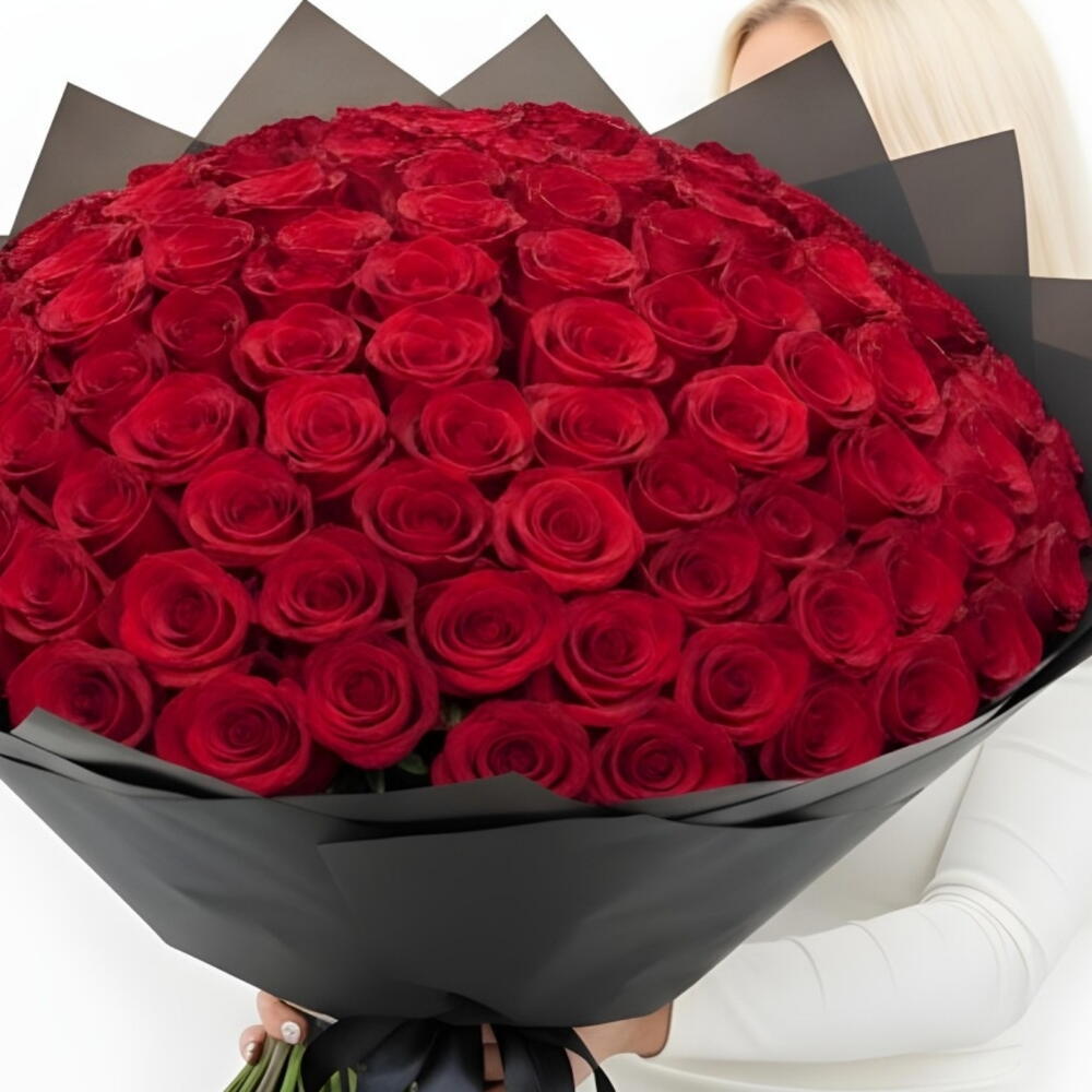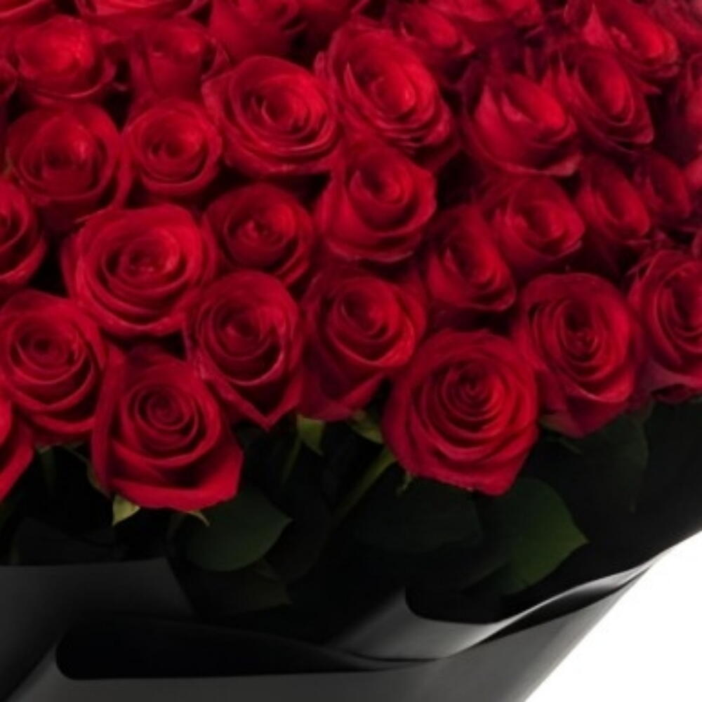 A extravagant bouquet composed of numerous red roses, elegantly presented and wrapped in luxurious black paper. The arrangement features high-quality, long-stemmed roses, each selected for its deep crimson color and lush petals.