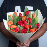 Bouquet of 19 mixed tulip with wrapped in a natural paper wrapping and tied with ribbon. All flowers will be very fresh and in the bud stage or semi bloomed. Flowers will be fully bloomed later when you keep in the water. Change the water everyday and cut slightly in the bottom in every two days