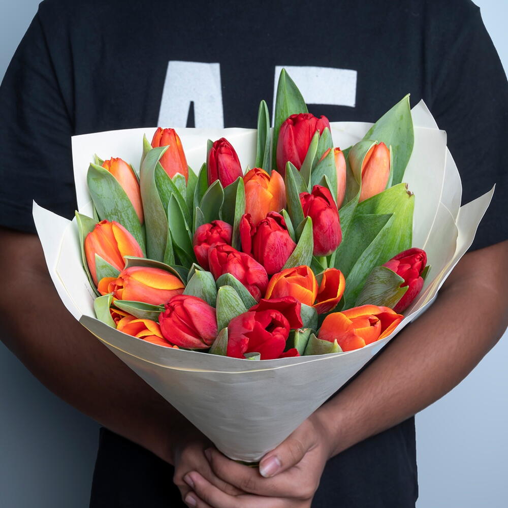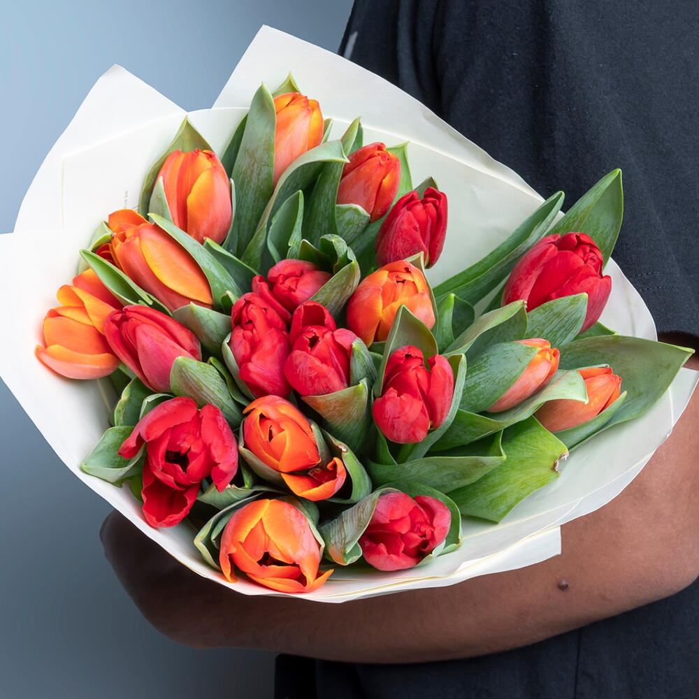 Bouquet of 19 mixed tulip with wrapped in a natural paper wrapping and tied with ribbon. All flowers will be very fresh and in the bud stage or semi bloomed. Flowers will be fully bloomed later when you keep in the water. Change the water everyday and cut slightly in the bottom in every two days