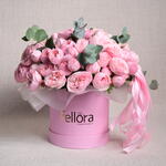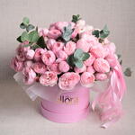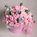A timeless arrangement featuring 19 Mansfield Park pink roses and 1 stem of eucalyptus, elegantly presented in a luxury flower box, exuding grace and sophistication,One stem of spray roses may have 3 or 4 flowers