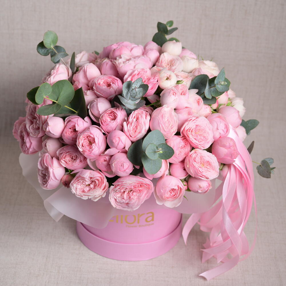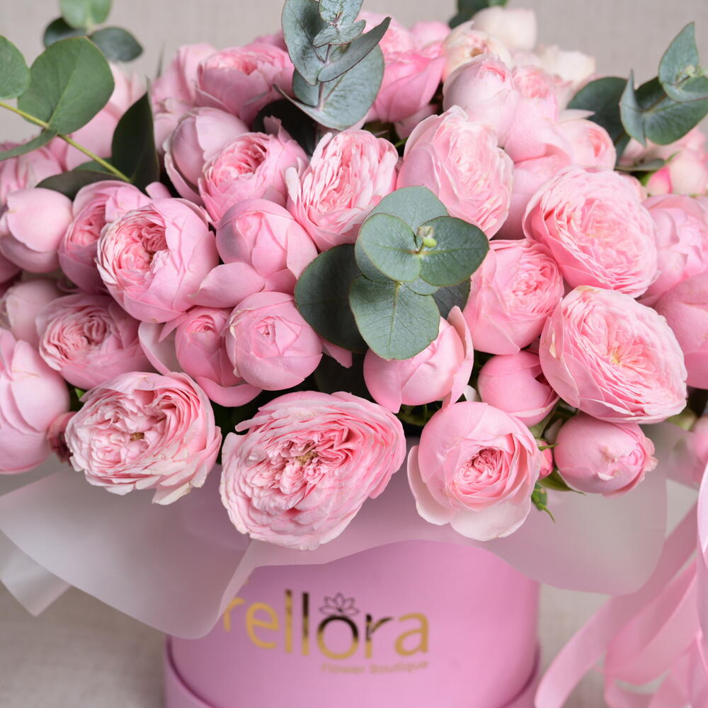A timeless arrangement featuring 19 Mansfield Park pink roses and 1 stem of eucalyptus, elegantly presented in a luxury flower box, exuding grace and sophistication,One stem of spray roses may have 3 or 4 flowers