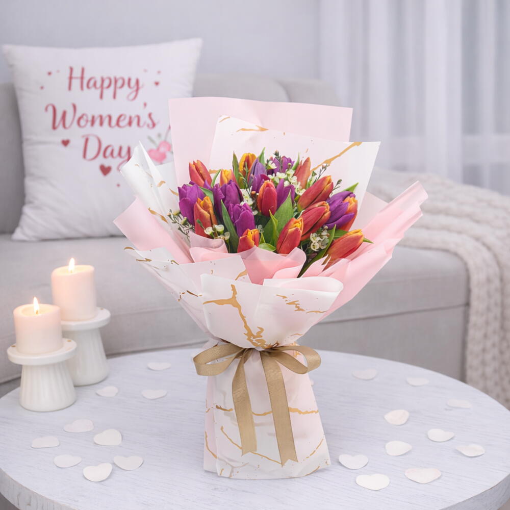 white wax - 5 pcs golden ribbon bow - 1 pcs red and purple tulips - 19 pcs white marble wrapping and pink plain wrapping - 5 pcs