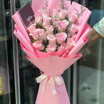 Bouquet of 20 pink rose with fillers in a nice wrapping. Beautiful bouquet of 20 pink roses with delicate fillers, elegantly wrapped for a charming presentation. Perfect for expressing love, gratitude, or admiration on special occasions. 20 pink rose bouquet, fresh rose arrangement, romantic floral gift, elegant flower delivery. Trim stems and place in clean water, keeping the bouquet in a cool area away from sunlight. Change water daily and remove wilted petals to maintain freshness.