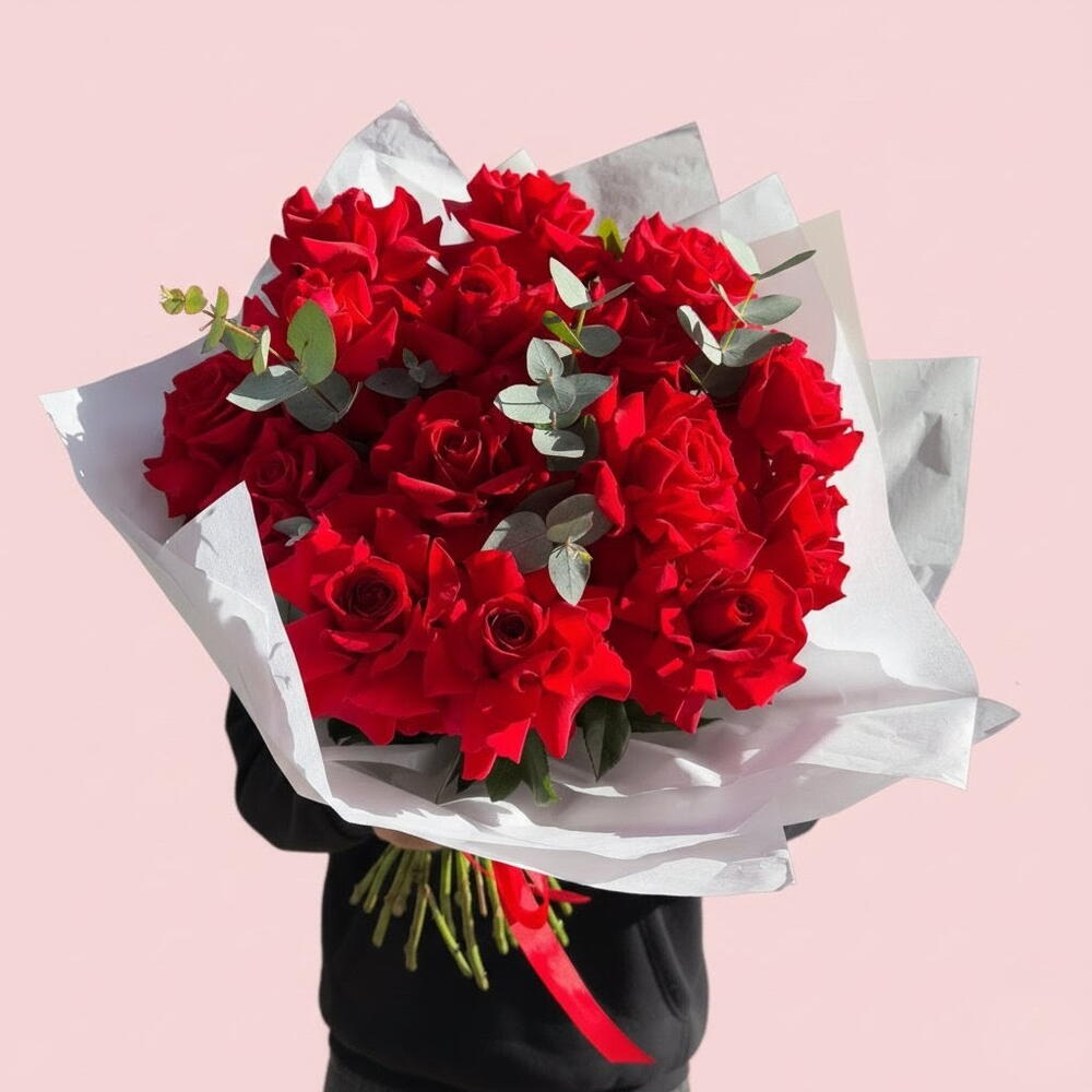This breathtaking arrangement features premium velvety red roses at the peak of their bloom, symbolizing deep love and enduring passion. Each rose is hand-selected for its rich color and full-bodied texture. To add a modern, earthy touch, we’ve interspersed delicate sprigs of silvery eucalyptus, which provide a fresh scent and a beautiful organic contrast. Wrapped in crisp, minimalist white paper and secured with a luxury red ribbon, this bouquet is the ultimate statement for anniversaries, proposals, or just because.