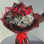 This classic red rose bouquet is a timeless expression of love, passion, and deep emotion. Velvety red roses are surrounded by a soft cloud of delicate gypsophila, creating a beautiful contrast between bold intensity and airy lightness. The rich burgundy wrapping enhances the depth of color and adds a luxurious, elegant finish. This bouquet makes a perfect gift for anniversaries, romantic occasions, proposals, or heartfelt celebrations. Its balanced, rounded shape looks impressive yet refined in any setting. To keep the bouquet fresh, place it in clean water immediately, trim the stems at an angle every 1–2 days, change the water daily, and keep it away from direct sunlight, heaters, and drafts.