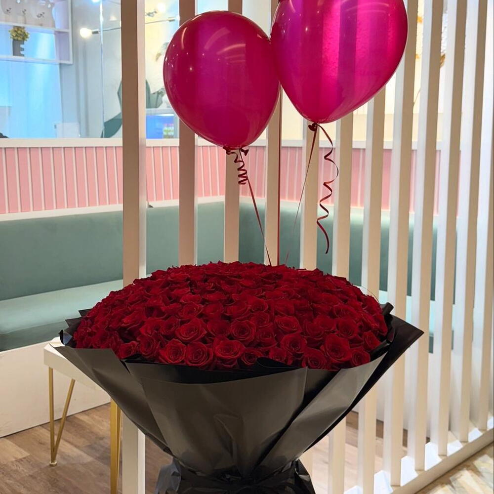 Unveil the charm of this balloon-bouquet fusion, adorned with two whimsically light balloons and an astonishing ensemble of 200 majestic roses. Each bloom tells a tale of beauty, love, and admiration. This Mono Bouquet offers a divine spectacle, meticulously arranged to evoke wonder and lustre at its sight, making it an impeccable choice to express your deepest sentiments.