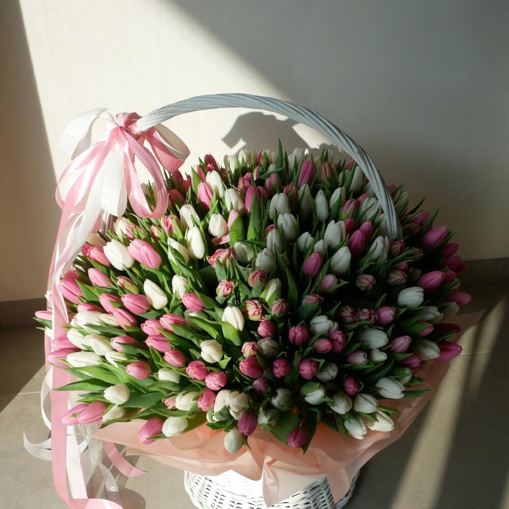 Basket - 1 pcs pink tulips - 101 pcs white tulips stems - 100 pcs