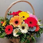 Basket - 1 pcs Green leaves - 5 pcs mixed Gerbera - 21 pcs