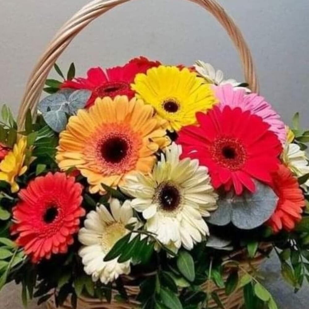 Basket - 1 pcs Green leaves - 5 pcs mixed Gerbera - 21 pcs