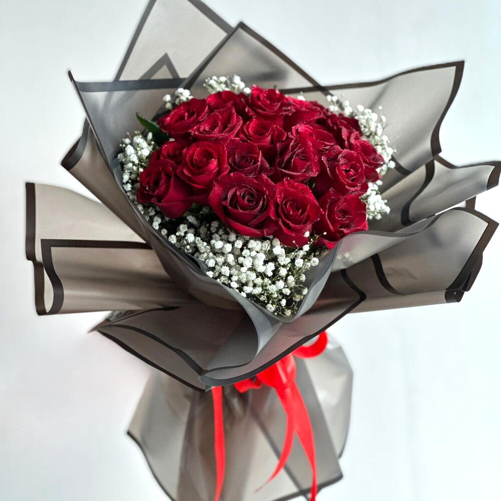 A Bouquet of 21 stems red rose with gypsophila in black wrapping