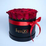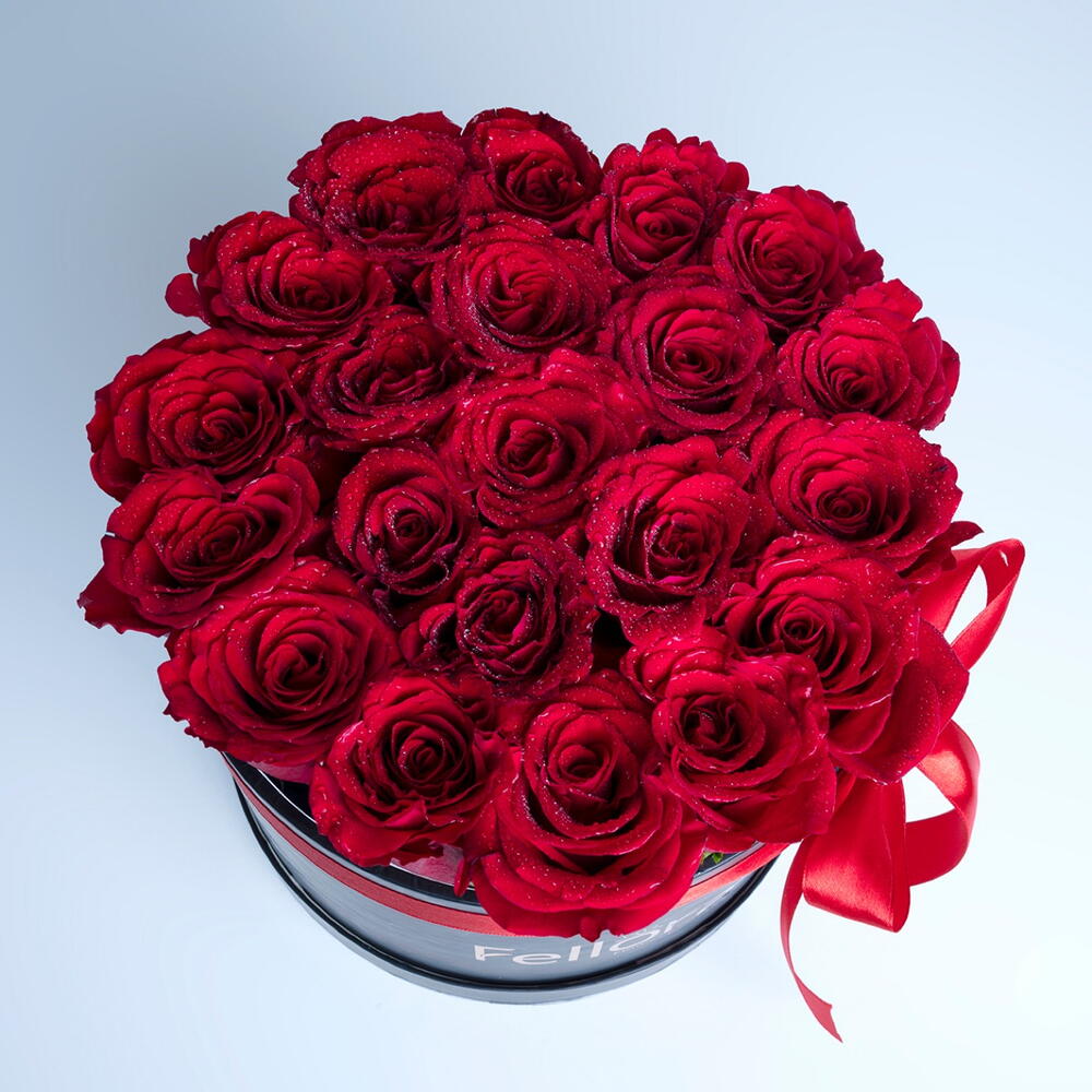Red rose - 21 pcs Ribbon - 1 pcs Black round box - 1 pcs
