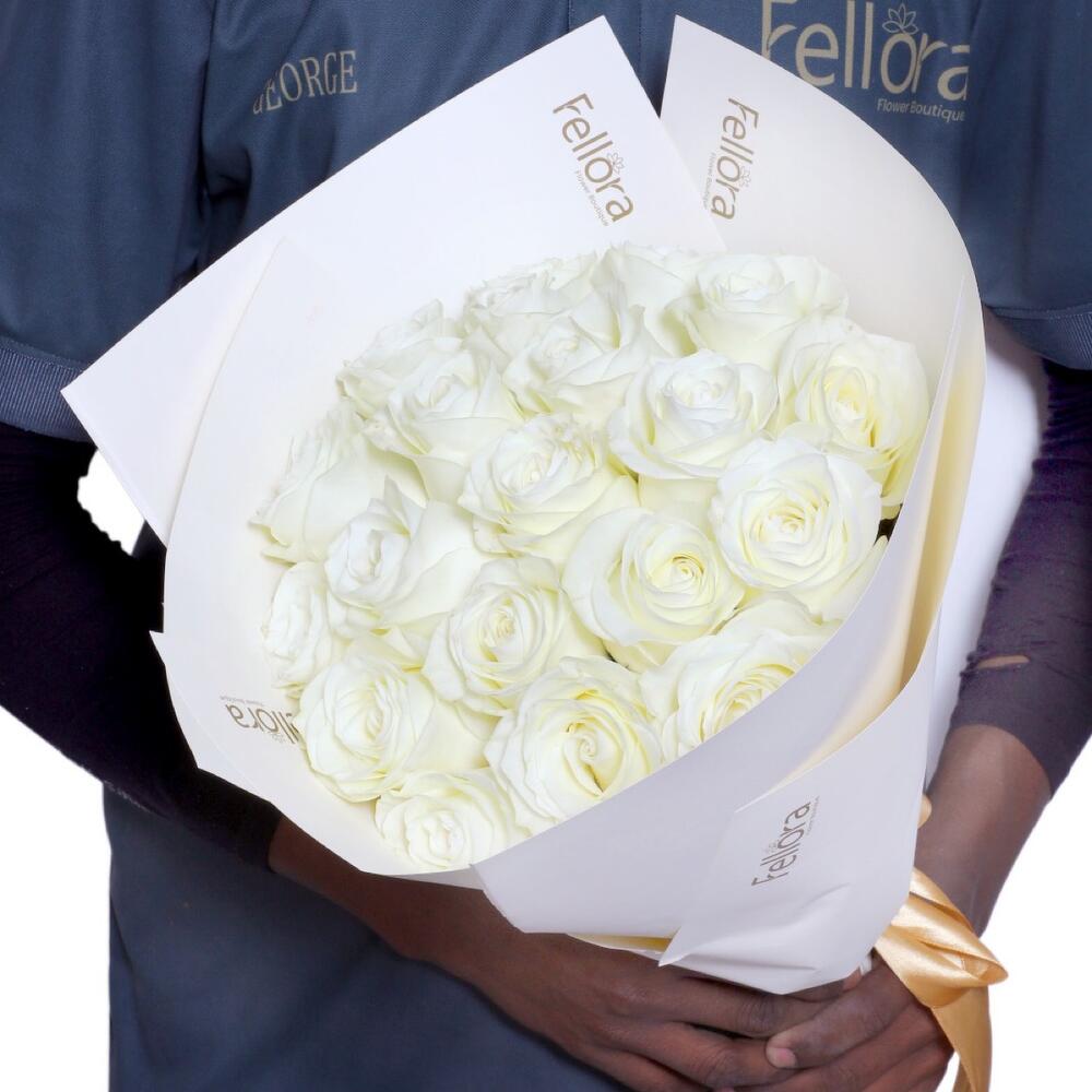 20 white roses arrangement in brown wrapping