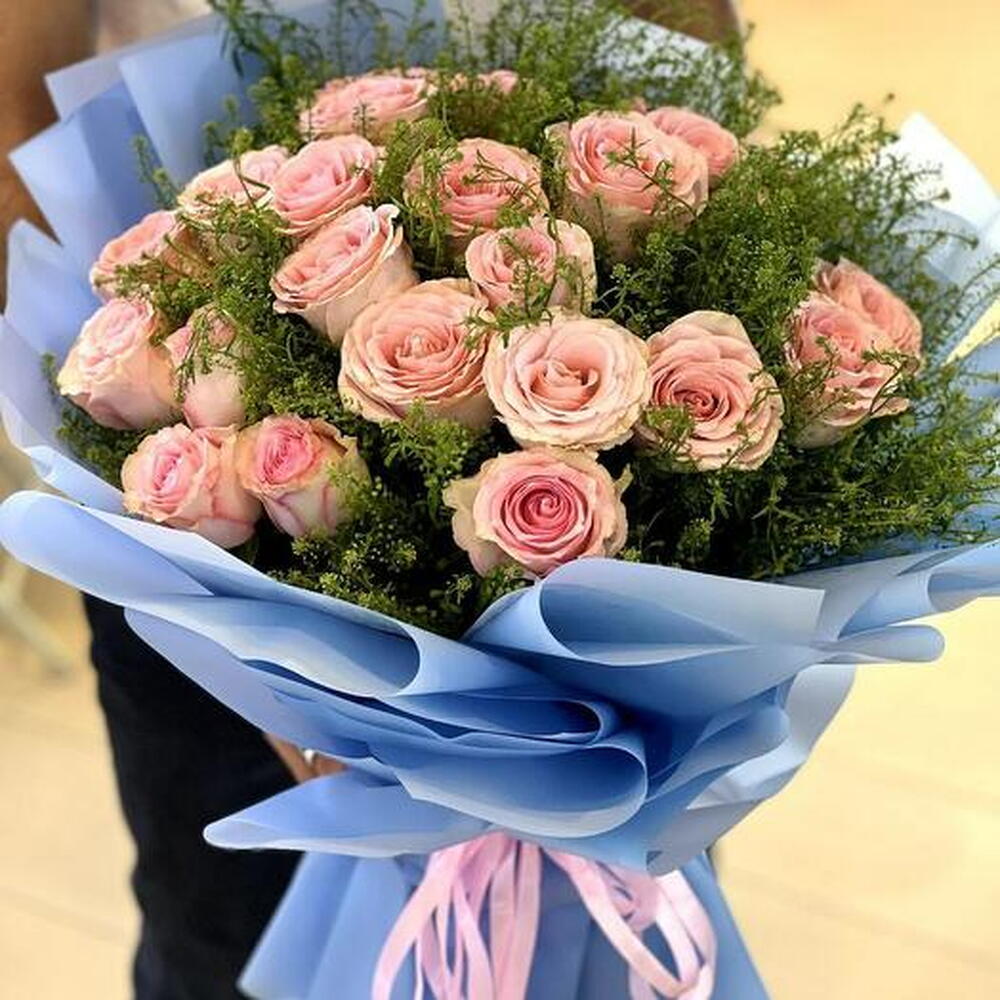 24 ROSES IN BQT LIGHT BLUE NICE WARPPING REBEN 300 AED