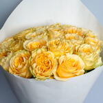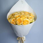 Bouquet of 25 stems premium yellow roses with wrapped in a natural paper wrapping and tied with ribbon. All flowers will be very fresh and in the bud stage or semi bloomed. Flowers will be fully bloomed later when you keep in the water. Change the water everyday and cut slightly in the bottom in every two days