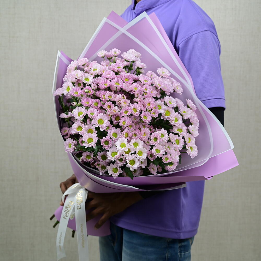 Experience the regal beauty of our Purple Majesty Chrysanthemum Arrangement, elegantly designed by Fellora Flower Boutique Dubai. This stunning arrangement features: 25 Stems of Purple Chrysanthemums: Each bloom radiates a rich purple hue, exuding sophistication and grace. Dimensions: Height: 45 cm Width: 45 cm Ideal for adding a touch of elegance to your home or as a thoughtful gift, the Purple Majesty arrangement brings a vibrant splash of color and natural beauty to any space. Let Fellora Flower Boutique Dubai transform your surroundings with this exquisite floral creation.