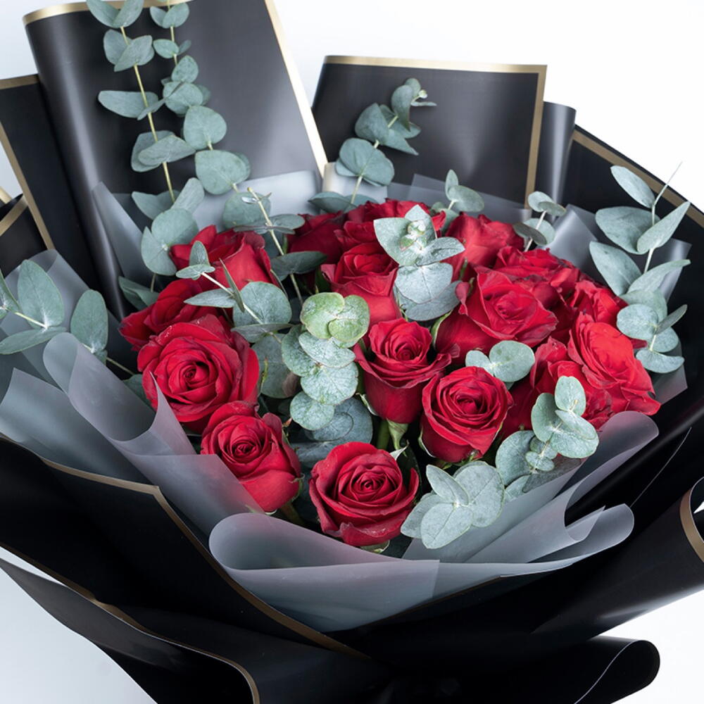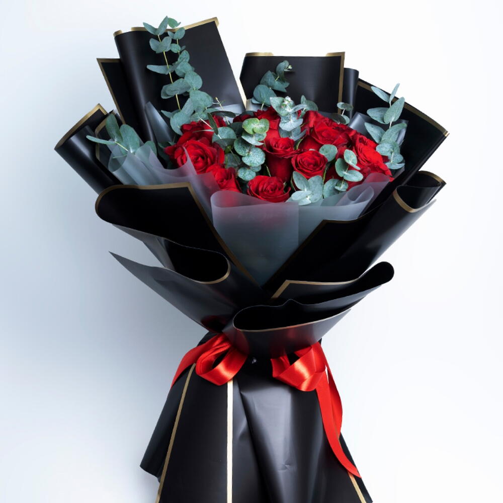 Red rose - 25 pcs ribbon satin - 1 pcs wrapping paper - 5 pcs eucalyptus leaves - 8 pcs
