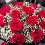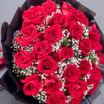 Make a bold and timeless statement of love with the Elegant Passion Bouquet, featuring 25 velvety red roses beautifully accented with 7 stems of delicate white gypso. Wrapped in 7 layers of sleek black paper and tied with a rich satin ribbon, this bouquet is the ultimate expression of romance and sophistication. Whether youre celebrating an anniversary, proposal, or sending a grand gesture of affection, this arrangement delivers elegance in every petal. Care Instructions: Trim the stems at a diagonal angle before placing them in clean, cool water. Refresh the water every 2 days and keep the bouquet in a shaded, cool environment away from direct sunlight or heat. Remove any leaves below the waterline to maintain freshness and avoid bacterial growth.