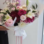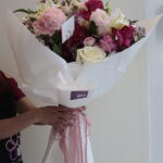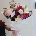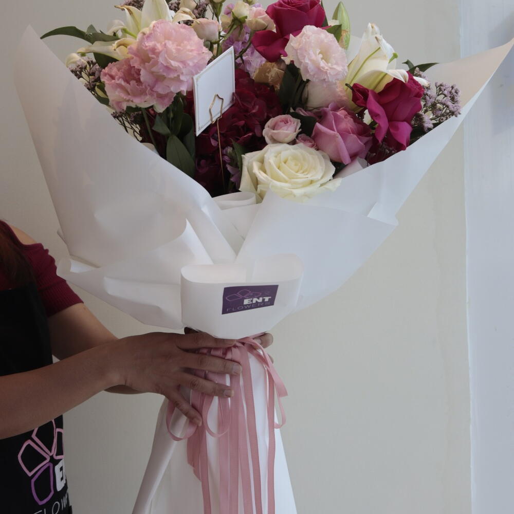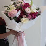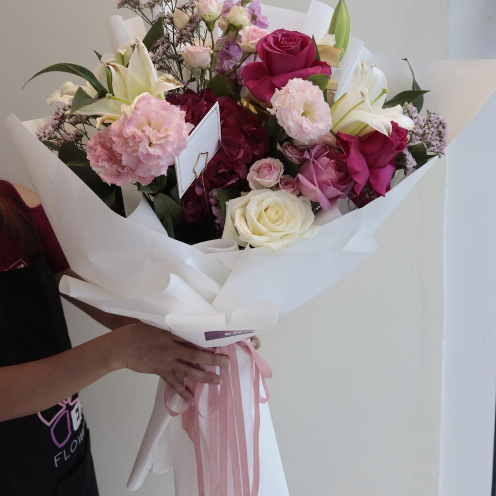 Pink rose - 3 pcs White rose - 3 pcs lily white - 2 pcs lemonioum - 3 pcs baby rose pink - 2 pcs astomerai - 3 pcs haydrenga - 1 pcs ruskas - 3 pcs