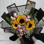 Sunflower - 3 pcs Gypsophila - 3 pcs pink spray rose - 3 pcs wrapping paper - 3 pcs