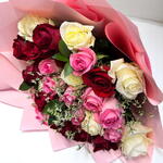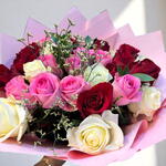 Celebrate every emotion with the 30 Mixed Color Rose Bouquet, a delightful combination of red, pink, and white roses. This stunning bouquet embodies love, admiration, and purity, making it an ideal gift for birthdays, anniversaries, romantic gestures, or heartfelt apologies. Carefully handcrafted and wrapped in soft pink paper, this bouquet is a perfect harmony of charm and elegance. Care Instructions: Trim the stems diagonally before placing them in a clean vase with fresh water. Replace the water every two days, keep the bouquet away from direct heat or sunlight, and mist the petals lightly to retain their freshness longer.