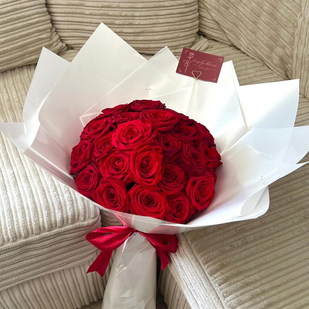 Overflowing with passion, elegance, and timeless beauty — this bouquet features 30 hand-picked premium red roses, each bloom selected for its deep, velvety hue and perfect saturation. Expertly arranged into a lush, generous bouquet, this arrangement is framed with fresh greenery and finished with refined touches to make sure it looks as stunning in person as it does in photos. To make your gift even more meaningful, a free message card is included so your words travel with the flowers. ✨ What makes this bouquet unforgettable: 30 premium long-stem red roses — rich color, full petals, ultimate romance Lush greenery for contrast, fullness, and texture 🌿 Beautiful presentation — wrapped or tied with elegance (depending on style) Free message card included — your sentiment becomes part of the gift ✍️ Freshness guaranteed — carefully hydrated, expertly handled, delivered in peak condition