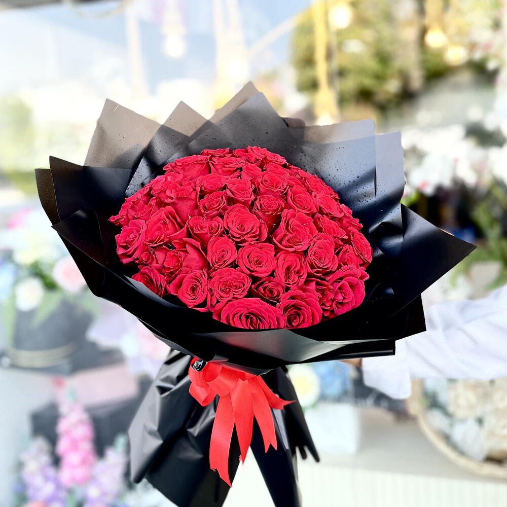 Immerse yourself in the enchanting beauty of our Florist Special consisting of 30 luxurious red roses, meticulously handpicked to ensure their perfection. Each bouquet is delicately tied together with a satin ribbon bow adding an extra touch of elegance. To optimize the grandeur, our bouquet is wrapped in six sheers of sophisticated black wrapping paper, presenting an opulent gift for any occasion.