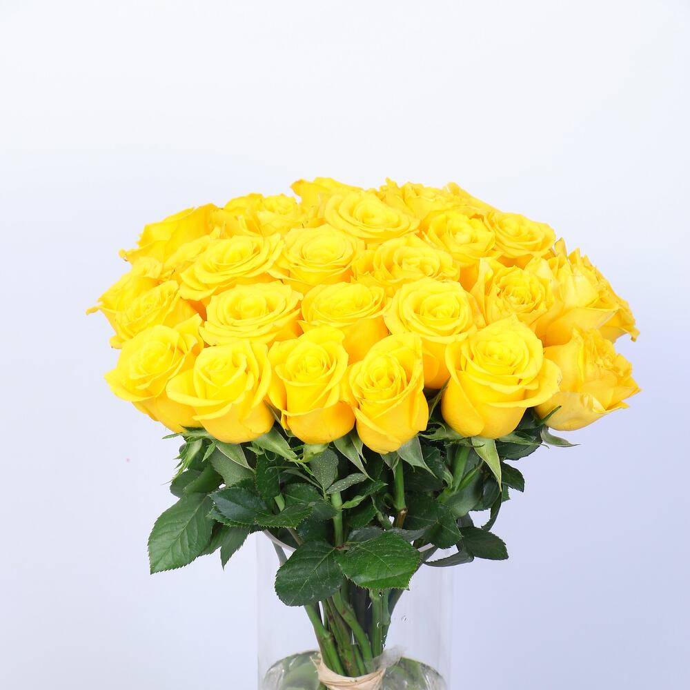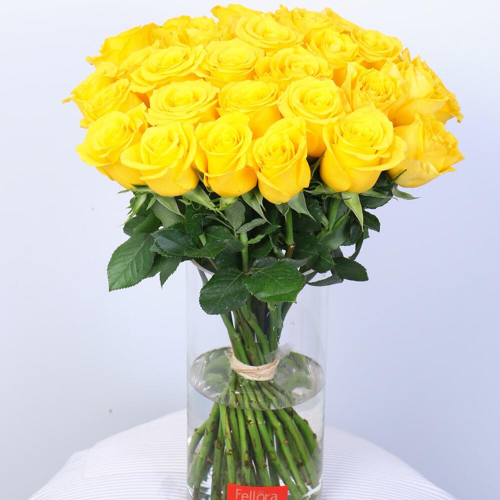 31 stems yellow flowers will be delivered in a cylinder vase Care Instructions: Cut the stems from the bottom at 45 degree in every 3 days and change water everyday to keep your flowers fresh. Avoid to keep from direct sunlight Our flowers will be very fresh and most of the flowers will be little bloomed or semi bloomed. We guarantee that all flowers will last more