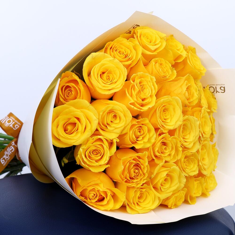 Details And Size: 31 Stems Yellow roses with height 50 to 70 cm height depending on variety. Wrapping: All bouquet will be wrapped in our locally made from sustainably sourced materials and is 100% recyclable and natural. All bouquet finishes with a Grosgrain Ribbon. Fresh Flower Guarantee: We guarantee 100% fresh flowers and happiness for all orders. If you are not happy with your order we will replace the item soon. Care Instructions: Remove the wrapping and put in fresh water. Cut the stems from the bottom at 45 degree in every 3 days and change water everyday.