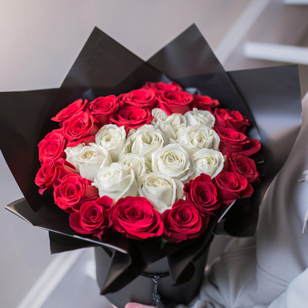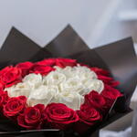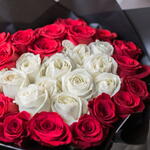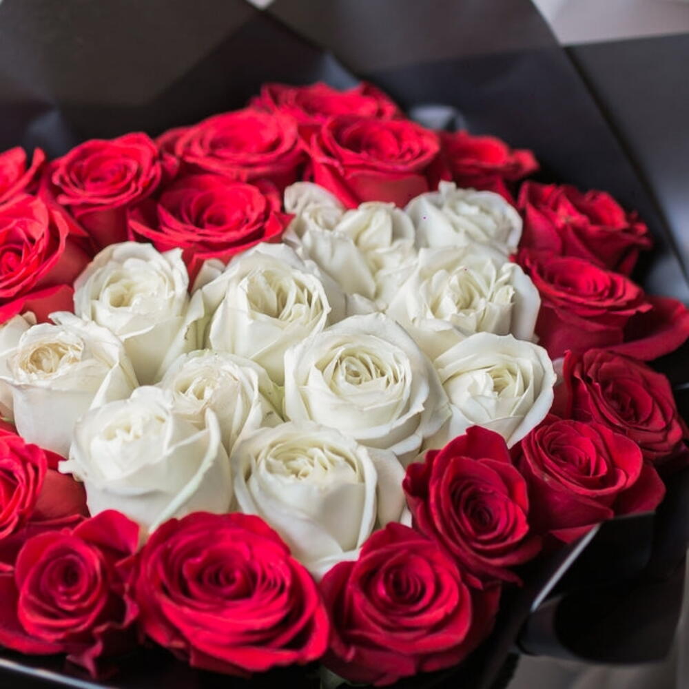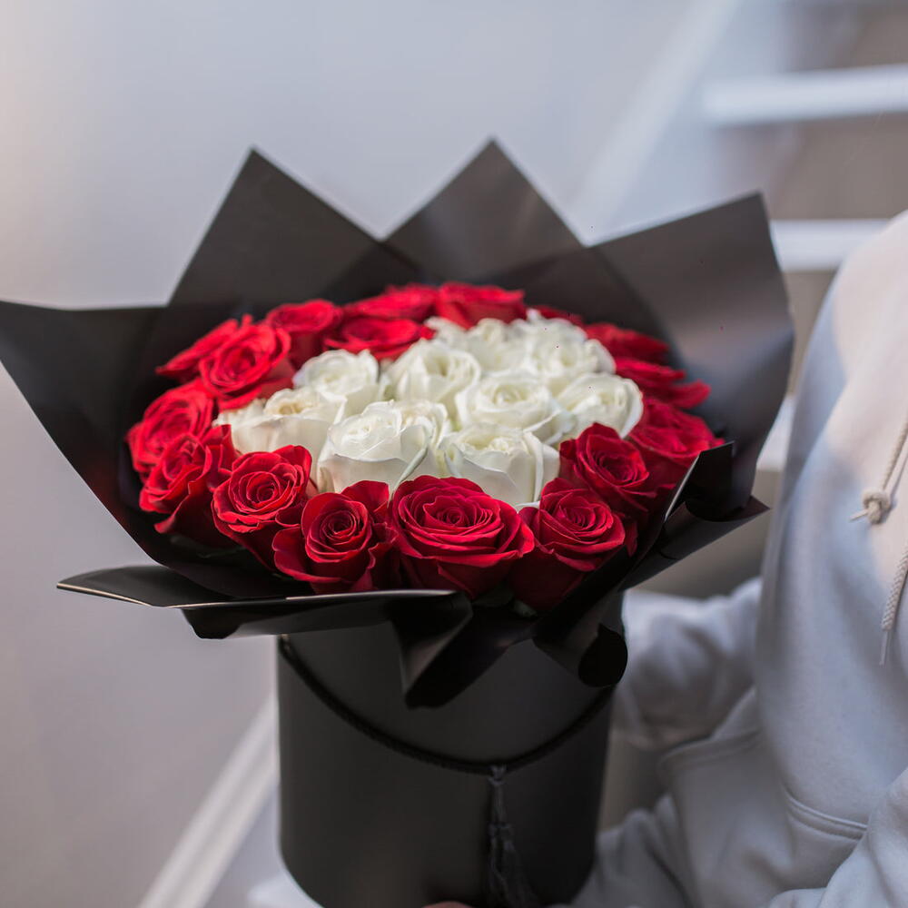 The best way to show your love. Our exclusive arrangement is with red and white roses in a luxury black boxRoses can be stored in the box as we have a special foam inside that keeps flowers hydrated. Just make sure you water the box with a bit of water every 2 days. Our arrangments always come with a greeting card. You can add a comment with your wishes to be written on a card.