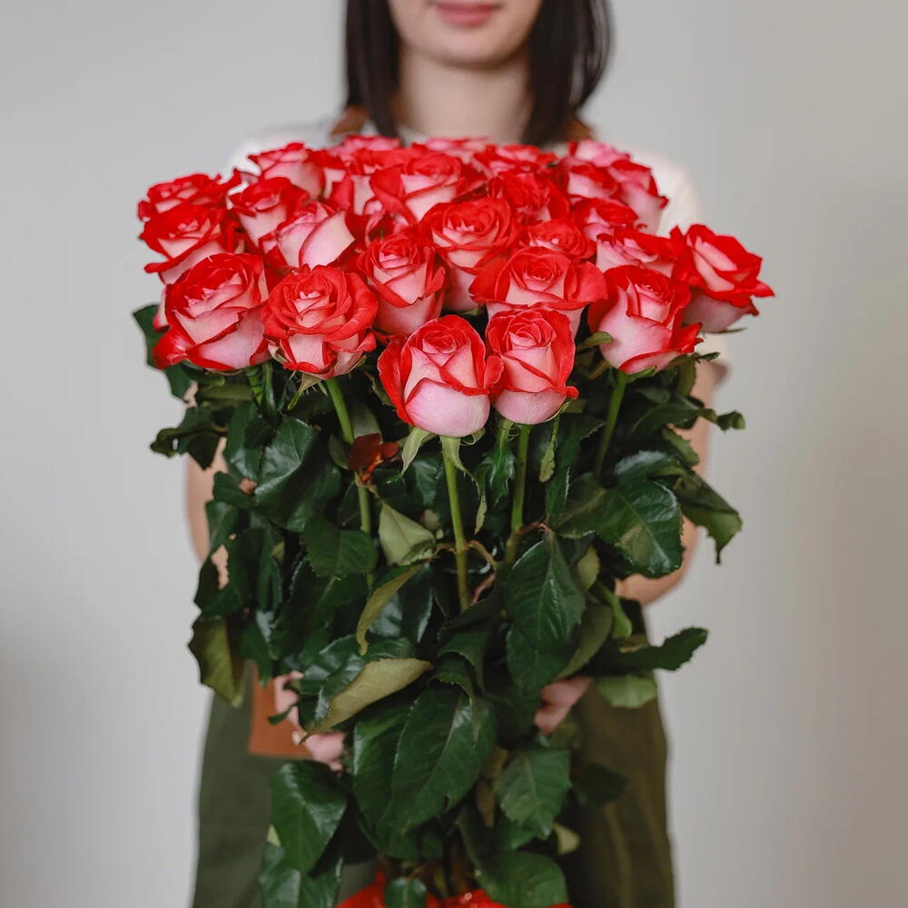 A striking bouquet of 31 premium roses in a unique red-and-white blend, carefully chosen for their long stems, large blossoms, and natural fragrance. Crafted with the B-Tween variety — admired for its contrasting petals that symbolize unity and love, comparable to the finest Holland roses. A bouquet of eternal bond, perfect for anniversaries, romantic surprises, or meaningful celebrations. ✅ Eternal Bond Collection ✅ 1-Hour Express Delivery (Dubai) ✅ Freshly Cut, Hand Delivered ✅ Long-Stem Premium Roses ✅ Fragrant Blooms ✅ Free Delivery Included
