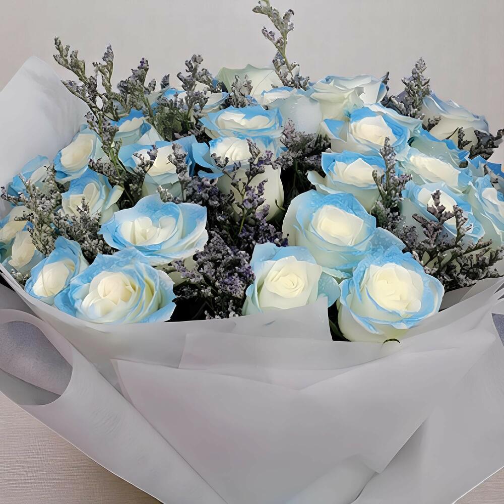 Ribbon - 1 pcs Limonium - 5 pcs Wrapping - 3 pcs sprayed white roses - 31 pcs