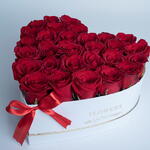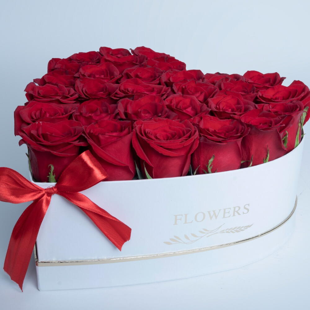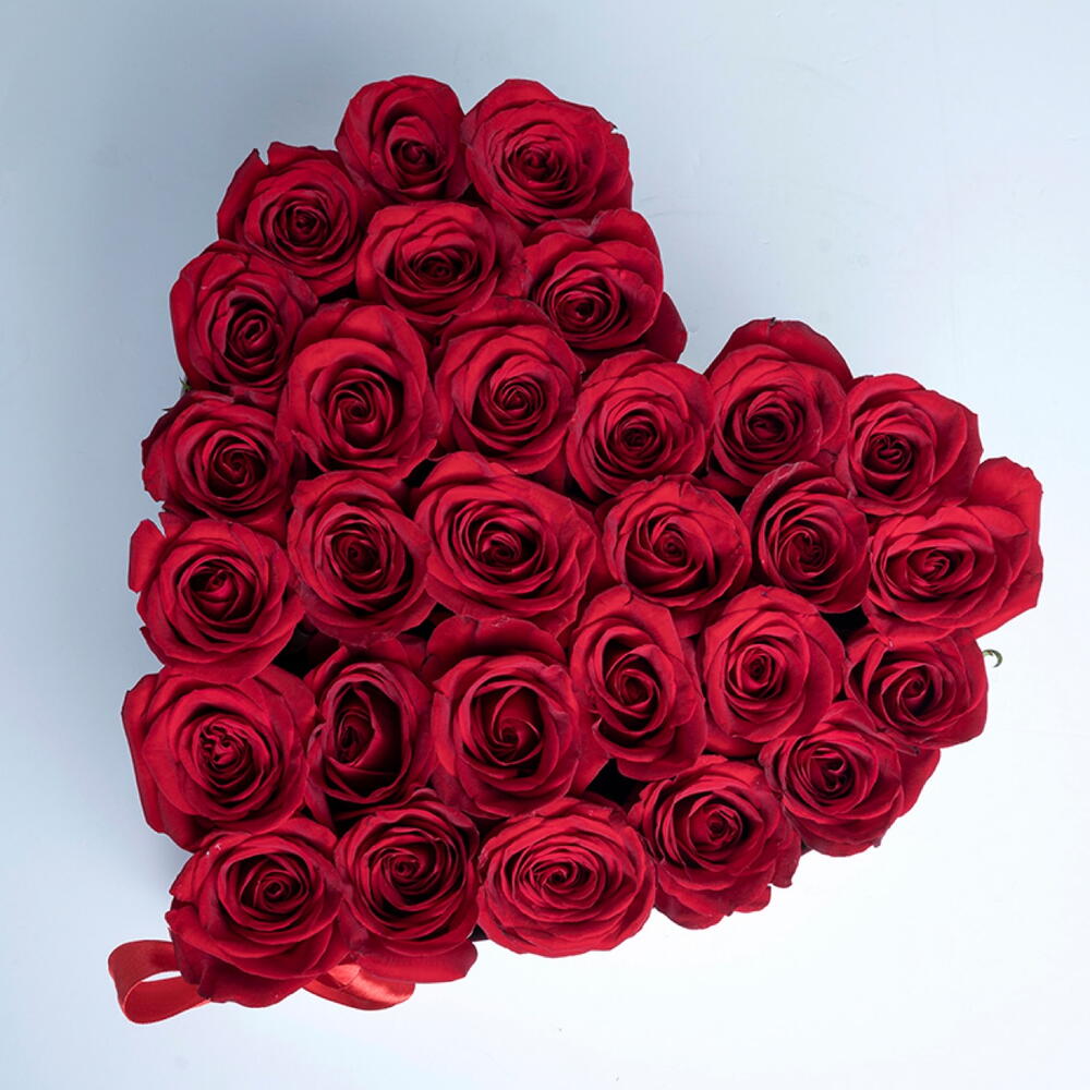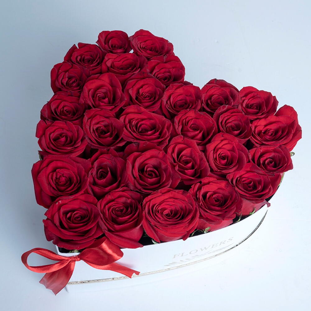 ribbon bow - 1 pcs white heart shaped box - 1 pcs red roses - 33 pcs