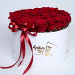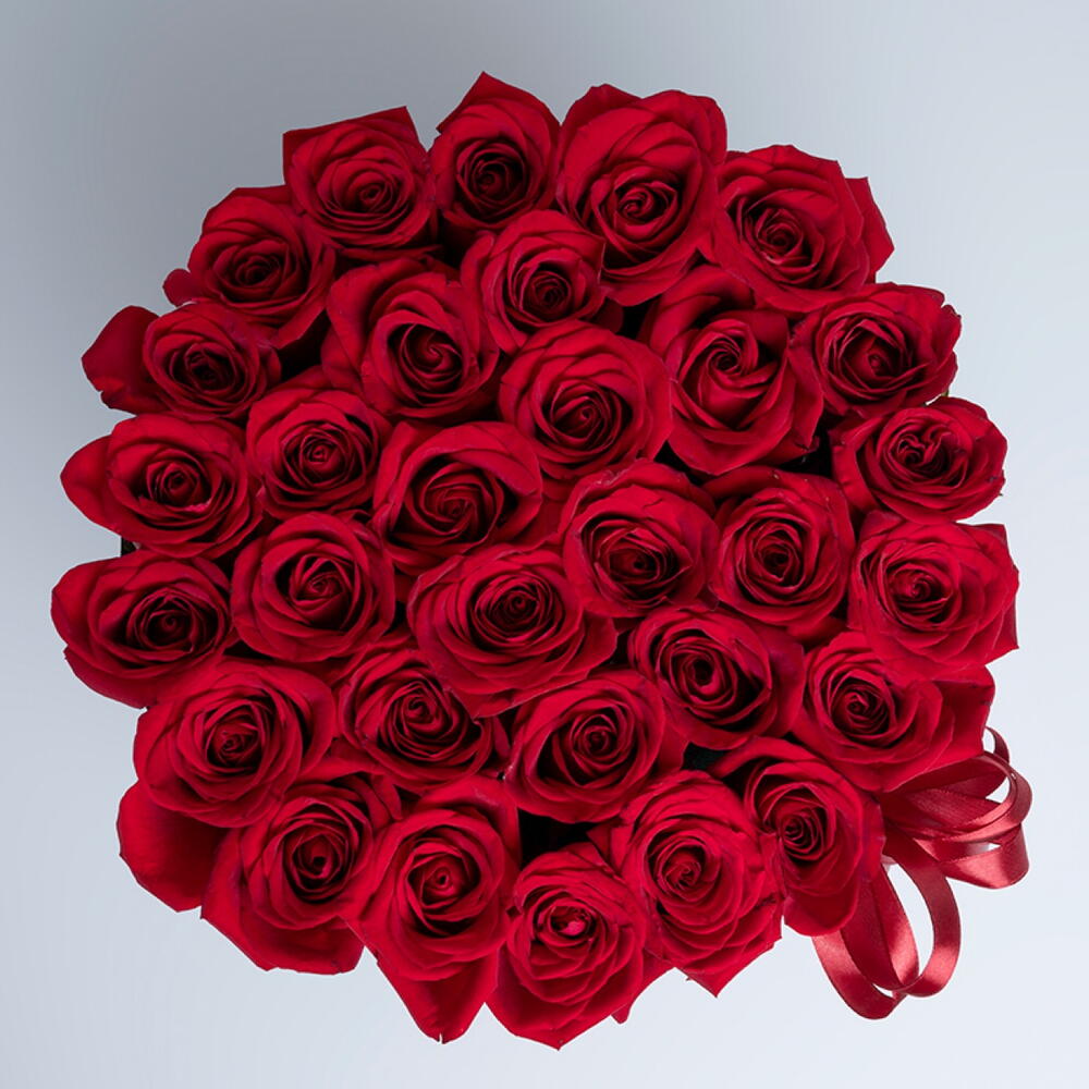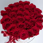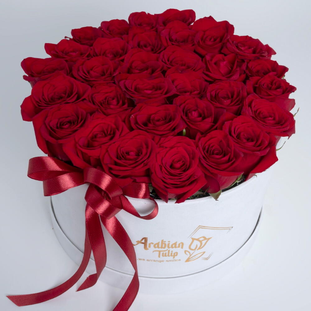 30 to 35 red roses arranged in a white box with red ribbon
